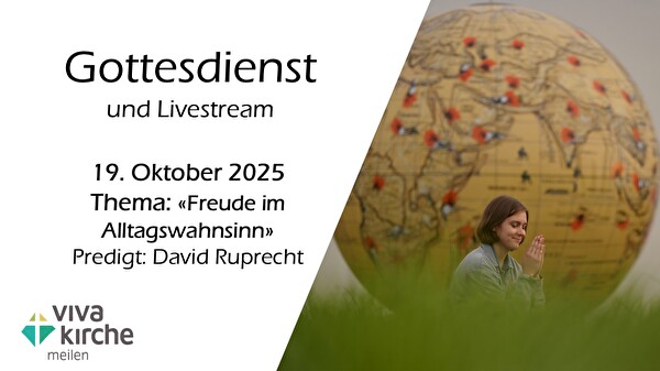 Gottesdienst mit Abendmahl und der Predigt von David Ruprecht zum Thema "Freude im Alltagswahnsinn". Parallel zum Gottesdienst wird ein altersgerechtes Kinderprogramm in entsprechenden Gruppen angeboten. Der Gottesdienst wird live gestreamt, Zugang über Youtube oder www.vivakirche-meilen.ch. Es gibt auch ein Übersetzungsangebot in rund 120 Sprachen.